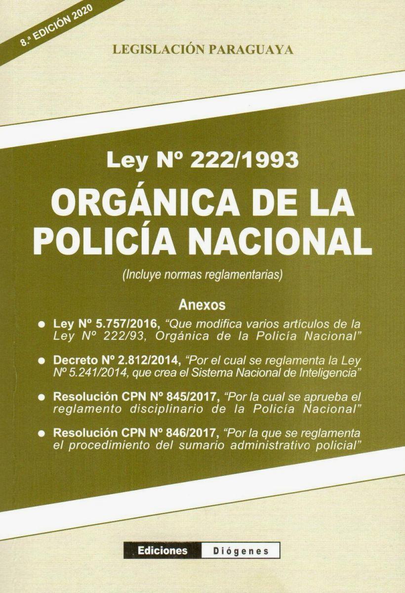 La Ley N° 222/1993 establece la organización, funciones, atribuciones y fines de la «Policía Nacional» como órgano encargado de la seguridad interna del Estado, con estructura funcional jerarquizada, no deliberante y obediente.